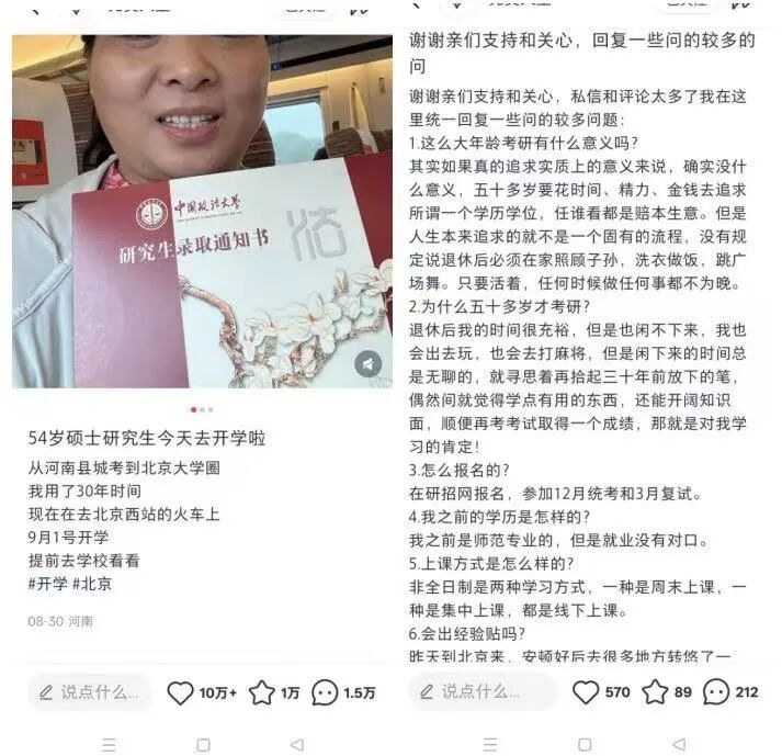 该网友称,“从河南县城考到北京大学圈,我用了30年时间,现在在去北京西站的火车上,9月1号开学,提前去学校看看。”其还专门解释大龄考研的意义,“人生本来追求的就不是一个固有的流程,没有规定说退休后必须在家照顾子孙、洗衣做饭、跳广场舞。只要活着,任何时候做任何事都不为晚。”