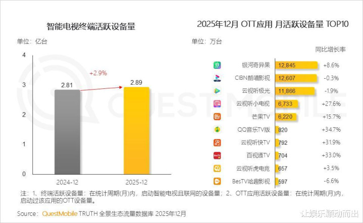 其次是场景价值的长线占位。春节强化了家庭团聚与合家共看的观看方式,而这一习惯正在回归日常。QuestMobile数据显示,2025年12月智能电视终端活跃设备量同比增长2.9%,OTT应用月活设备量TOP10中,爱奇艺银河奇异果稳居第一。