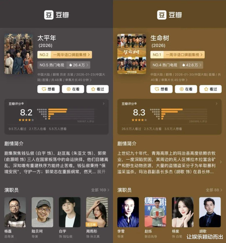 与此同时,历史题材大剧《太平年》与现实主义大剧《生命树》,也凭借高品质制作与国民演员阵容,在春节期间爱奇艺热度值与观看时长双双进入剧集频道TOP5,并分别收获豆瓣8.2和8.3的高分。